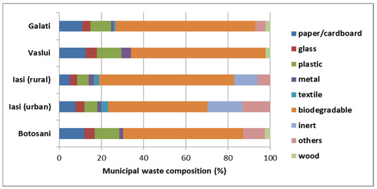 The transition from subsistence agriculture to small-scale organic farming businesses must be supported in eastern Romania as a key sustainable development route. Enhancing home composting practices in rural areas under the implementation of the regionally integrated waste management system is compulsory considering biowaste is the main waste stream in rural and urban communities of eastern Romania, as shown by Figure 5.