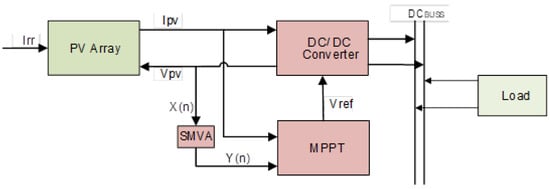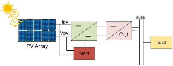 Fossil fuel depletion and international market price instability diverted the attention of the world to renewable energy technologies (RETs) to fulfill their electricity demand [,]. RETs have abstracted the substantial consideration of power industry to focus on research and development and its maximum exploration to satisfy the increasing energy demand in the world [,,]. Because of the cumulative dissemination of RETs into the traditional power system, their status has been changed from secondary to primary energy sources [,]. Among all the renewable energy sources, solar photovoltaic is considered one of the most promising and sustainable power generation options because of technological developments and per-watt cost reduction in power generation system []. However, because of weather intermittency, fluctuations in the solar photovoltaic output are produced. This happens because of non-uniform solar irradiance, which is not uniform between adjacent locations at a short time scale. This non-uniform solar irradiance is considered one of the overbearing or unsolvable reasons in solar PV power generation system, which leads to overall system losses []. To achieve optimized and stable output from the PV system under non-uniform solar irradiance conditions, a device named maximum power point tracking (MPPT) is connected between the PV panels and the power converter, as depicted in Figure 1.