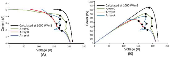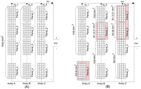 Solar PV Array with (A) uniform and (B) non-uniform solar irradiance [,].