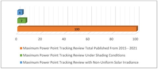 A Google Scholar online survey from 2015 to 2021 was conducted to scrutinize how many review papers were published over these years. With the first search query, “Maximum Power Point Tracking Review”, 100 articles were found successfully. Subsequently, when the search query was explicitly restricted to “Shading Conditions” and “Non-Uniform Solar Irradiations”, only seven on “Shading Conditions” [,,,,,,] and four review articles on “Non-Uniform Solar Irradiations” [,,,] were found, as depicted in Figure 4.