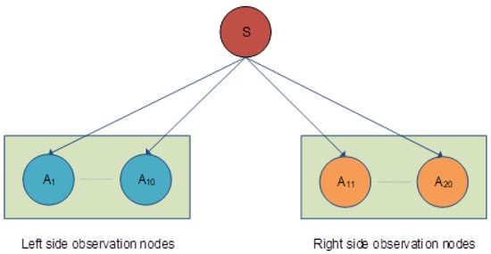 For example, as illustrated in the aforementioned Figure 6, two MPPT methods, such as incremental conductance and particle swarm optimization, are used to configure a Bayesian Network. This contains twenty nodes , which are then parted into right and left block nodes that contain an equal number of nodes; to for the left station and to for the right one, with each observation station using a different MPPT tracking method. A projected location after Bayesian fusion is denoted with the character S [,]. After that, the observations of both stations are then checked to see whether their entries match with a value of 1 attributed to matching points and 0 to non-matching points. Thus, the best-known nodes are given a probability, which will help in determining the MPP by following the Equation (1) []: