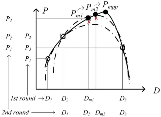 In the NLP method, an algorithm is used to determine the maximum power point via using a predictor function. This function is based on the power-voltage (P–V) and current-voltage (I–V) graphs, with the latter being the more widely used in most cases []. The algorithm chooses the maximum power point by using previous duty cycle input and the resultant data for the power points. Shown in Figure 7, points, , and represent the previous data cycles, which resulted in power points , and . The predictor function then uses those data points to generate a new duty cycle with point and its corresponding power point at point A. However, and do not match on the P-V curve, which leads to the generation of a new duty cycle by the predictor function with power point and . does not match at B and the predictor function again generates another cycle. This process is repeated until an accurate duty cycle is reached, where its matches [,].