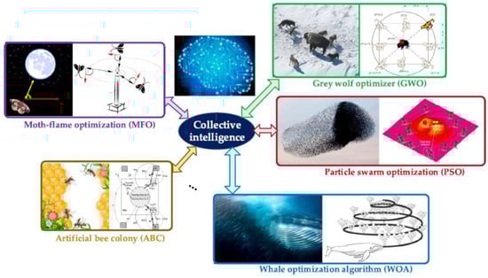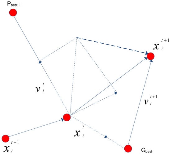 This method was developed based on the behavior of fish schools and bird flocks in travel and in the search for food and is considered to be a stochastic algorithm []. In this method, multiple particles search for the right patch and cooperatively exchange the information of their search among themselves as they conduct such a search, as shown in Figure 10. The right path is decided either by the optimum solution found by all of the cooperating particles or by the best local solution . The equation governing the best location is shown in Equation (7), which is as follows [,]: