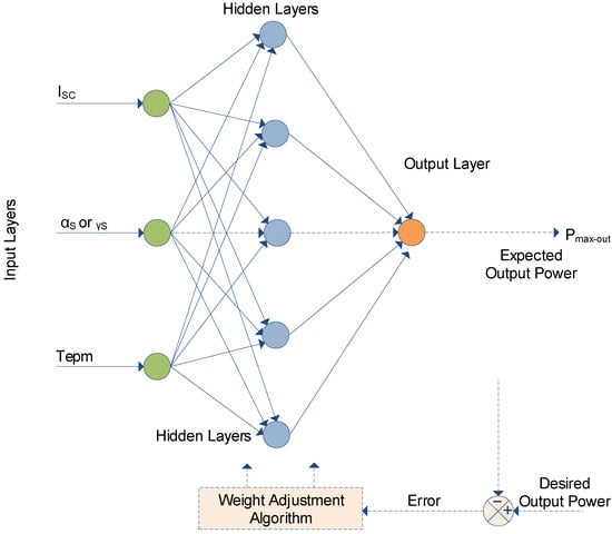 The artificial neural network is usually implemented in nonlinear photovoltaic systems in order to approximate the maximum power point where it reports more adequate results in comparison to other more traditional maximum power point tracking methods [,,,,]. The method is inspired by the biological neural networks (BNN). In the ANN-based MPPT method, a large number of points, also known as nodes or neurons, are stacked in layers which are interlocked. An example of a feed-forward neural network system configuration is illustrated in Figure 12, where the system consists of an input layer followed by one layer or several layers, which are hidden, and an output layer. All of the nodes in a feed-forward artificial neural network system are linked to each other and organized in contiguous layers that employ synaptic weights, as explained in [].