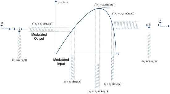 As illustrated in Figure 13, this method works by employing the ripples generated by the switching converter to calculate sinusoidal perturbation of the V-P curve as well as its slope. In a system that has a non-linear input, the output oscillates around the average value when a low-amplitude sinusoidal function is summed with the input signal . Then, the slope of the function can be used to track the MPP of the photovoltaic system, as sketched in Figure 14 [,].