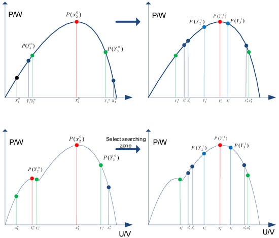 As illustrated in Figure 8, the maximum power point tracking is shown in a system that is partially shaded with global and local MPPs. By using the CS method, three samples are chosen, labeled in green color, in red and yellow. is the closest to the maximum power point and and are forced to move (take flight) towards during the first iteration. In the second iteration, becomes the closest to the maximum power point and the other samples ( and ) move towards it. This process is repeated until the three samples cover the global maximum power point [].