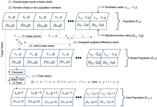 This is a vital step in the SC-MPPT methods, during which the population chosen in the earlier step, named the parent, is used to produce a subsequent generation, named the descendant, via an algorithm. The algorithm used in this step distinguishes the capability of each SC-MPPT method to produce the next generation. Some algorithms are based on the social behavior insects or animals, such the Ant Colony Optimization (ACO), the Particle Swarm Optimization (PSO) and the Cuckoo Search (CS) methods. On the other hand, other algorithms are based on natural genetic evolution, such as Extremum Seeking (ES), Genetic Algorithm (GA) and Differential Evolution (DE) methods. For example, the production of the population is achieved by applying Lévy flight in the CS method and by utilizing particle velocity in the PSO method, which are precise reproduction operatives, while the latter methods utilize genetic operators for such a recombination, also known as crossover, and mutation to achieve the same task. A randomly chosen individual’s value is changed in the mutation operator, while two individuals exchange some parts in the recombination operator.