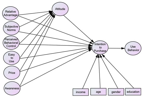 Several studies have shown social and economic factors as essential in relation to primary determinants and behavioral intention [42]. This study posits that the demographic factors of age, gender, education, and income control the relationship between the selected variables and purchase intention. A survey on the buying of domestic energy-efficient and renewable power facilities in China showed that households’ incomes positively moderate the interaction between purchasing attitude and intention, and incentives in the form of subsidies are more likely to enhance purchasing [77]. High-income and trained professionals have shown they are more likely to pay for clean energy, and young people are more supportive of renewable power adoption [78,79]. Some studies have also highlighted the impact of gender on the adoption of renewable energy, i.e., males imvested more than females in adopting renewable energy in Kaohsiung and Pingtung, Malaysia. [33] However, women in LA, USA showed much higher tendencies than men in terms of green buying and ecological attitudes [80,81]. While studies show the influence of socio-economic factors, income has not been found to impact the adoption of renewable energy [33] significantly. This study posits that the level of control or influence of socio-economic factors may vary depending on many factors according to the individual environment. To investigate this perspective in Nigeria, the following hypotheses were formulated: