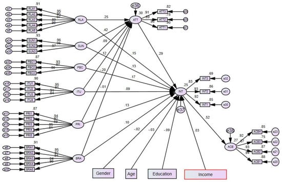 Table 5 and Figure 2 show the proposed relationships between the studied variables in the structural model. Table 5 shows the p values, parameter estimates, and critical rations of the constructs. H1 proposed that RLA has a positive and significant impact on ATT, and H2 proposed that SUN positively effects the ATT with values of p < 0.05 and estimate = 0.333. H3 stated that PBC positively relates to the ATT, with p < 0.05 and estimate = 0.030. H4 proposed the positive impact of ITU on ATT (p < 0.05, estimate = 0.105). Meanwhile, H5 stated that PRI negatively relates to the ATT (p < 0.05, estimate = −0.149). The hypothesis H6 stated BRA negatively impacts the ATT, with p < 0.812 and estimate = −0.006. The hypothesis H7 stated RLA positively impacts INT (p < 0.05, estimate = 0.138). H8 claimed that SUN significantly and positively effects ATT (p < 0.05 and estimate = 0.116). The hypothesis H9 stated that PBC positively impacts INT (p < 0.05, estimate = 0.141). The hypothesis H10 stated that ITU is related positively to INT (p < 0.05, estimate = 0.084). The hypothesis H11 claimed PRI and INT relate positively, with p < 0.05 and estimate = 0.098. H12 claimed BRA positively and significantly relates to INT (p < 0.812, estimate = 0.075). H13 claimed that ATT positively effects INT (p < 0.05, estimate = 0.298).