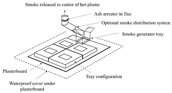 Prior to these full-scale experimental tests, the equipment and the ventilation system of the station were already completed. In the full-scale experiments, ethanol (95%) was used as the fuel of the pool fire, and the area of the oil pan was set to be 0.5 m2. As shown in Figure 4, a smoke generator was employed to consistently produce smoke for better observation of the smoke movement. The common platform fire was caused by luggage. The safety of the full-scale experimental subway stations was taken into consideration. The heat release rates of the fire source in the three tests were all set 0.7 MW based on a previous study []. The details of the test conditions are shown in Table 1.