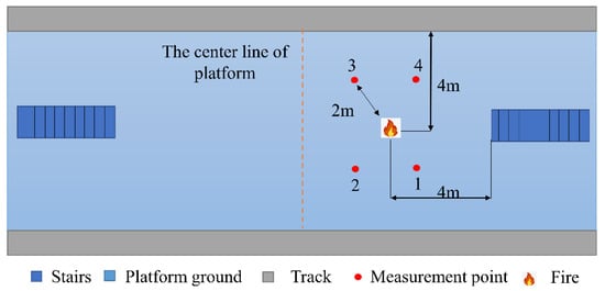 Two methods were used to measure the settlement of the smoke layer []. One way was to settle an air-sampling instrument at the platform to estimate the change in smoke concentration. Another method was to judge smoke-layer descent by measuring the temperature change at different positions of the thermocouple tree. In the tests, measurement systems were set as follows: (1) For station B and station C, with a high atrium, a K-type thermocouple tree was used to record the temperature from 2.5 m to 9.0 m height above the fire source. Thermocouple measurement range has been found to be 0–1300 °C with accuracy of ±0.75%. From 2.5 m to 4.0 m above the fire source, the vertical distance between each two sets of thermocouples was 0.5 m. To obtain the temperature at the height of human eyes and the platform ceiling, the vertical interval was set as 1.0 m in a 4.0–9.0 altitude range, as shown in Figure 8b,c. Two measurement points were set in the platform and hall, respectively, to record the environment temperature change, at 2 m height. (2) For station A with a 5.6 m-height platform, four measuring points (points 1–4) were symmetrically arranged around the fire source, as in Figure 5. The longitudinal distance between the four measurement points and the fire source was 2 m. Each measuring point was arranged with six thermocouples in the vertical direction, with the height ranging from 1.5 m to 3.0 m, as shown in Figure 8a.
