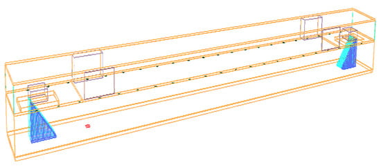 As shown in Figure 9, Figure 10 and Figure 11, the numerical simulation models of subway stations were established by Fire Dynamics Simulator (FDS) software. Figure 9 shows the atrium-type station simulation model. The concourse was 182 m × 22 m × 3.5 m in size, and the dimensions of the platform were 155 m × 15 m × 5.4 m, with a 9.4 m atrium height. There were three subway entrances and three escalators. The dimensions of the platform shown in Figure 10 were 132 m × 12 m × 3.8 m, and the size of the concourse was 97 m × 13 m × 3.8 m, with three escalators and one ladder. The subway model in Figure 11 presents a 132 m × 12 m × 5.5 m platform, and a 132 m × 13 m × 3.8 m station hall, with two escalators. The station entrances were set as “SUPPLY”, and the exhaust vents were arranged symmetrically with the dimensions of 1 m × 1 m and set to be “EXHAUST”. The structural materials of wall, ceiling, and floor were all set as “INERT”. In addition, the initial conditions were as follows: the temperature was 20 °C, the pressure was 1.01 × 105 Pa, and the smoke concentration was 0 mol/mol.