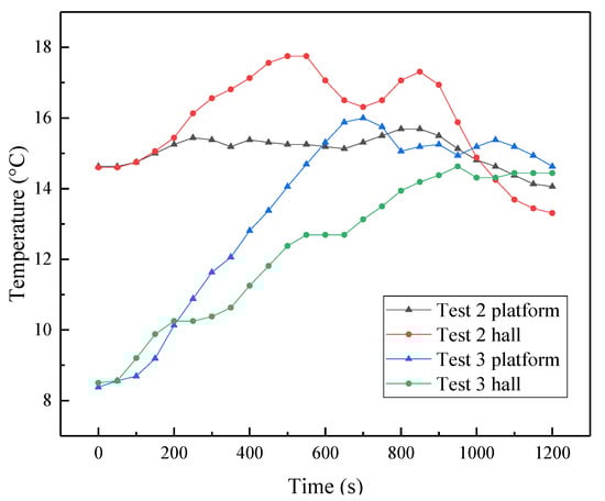 Figure 20 shows the temperature variations at 2 m height of the platform and hall in Test 2 and Test 3. In Test 2, temperature at 2 m height of pedestrians was maintained at about 16 °C. In Test 3, the temperature was on an upward trend and the peak temperature reached 8 °C higher than the station initial ambient temperature. This may have been influenced by the large height of the atrium. When the temperature inside the station gradually rose, the inverted stack effect was produced by the atrium cold roof in winter, which inhibited smoke extraction and caused heat accumulation.