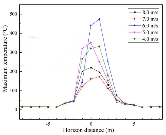 Figure 21 shows the variation of horizontal maximum temperature at 9.4 m height-atrium subway stations. The horizontal maximum temperature rose rapidly, mainly concentrated in the area of 5 m away from the fire source. The temperature range in other areas was relatively stable, about 10 °C. It may have been influenced by the high space of the atrium. Smoke mainly spread in the vertical direction near the fire source [,,]. The smoke in a horizontal direction spread more slowly and formed a stable smoke layer above the fire source. The rise in horizontal smoke maximum temperature could be controlled at a relatively low level under 7.0 m/s, and the peak temperature was around 180 °C.