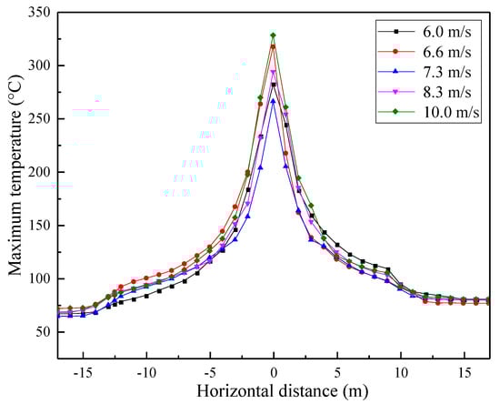 It can be seen from Figure 22 that when the exhaust velocities were 7.3 m/s and 10.0 m/s, respectively, the temperature could be controlled at a relatively low level in the 3.8 m-platform island subway station. Figure 23 shows the horizontal maximum temperature variation along the length of the platform. Within 15 m away from the fire source, the maximum temperature was higher than other regions. This was a result of smoke accumulation in this area leading to heat assembling. Under 7.3 m/s, the peak temperature reached 260 °C and about 70 °C lower than that of 10.0 m/s.