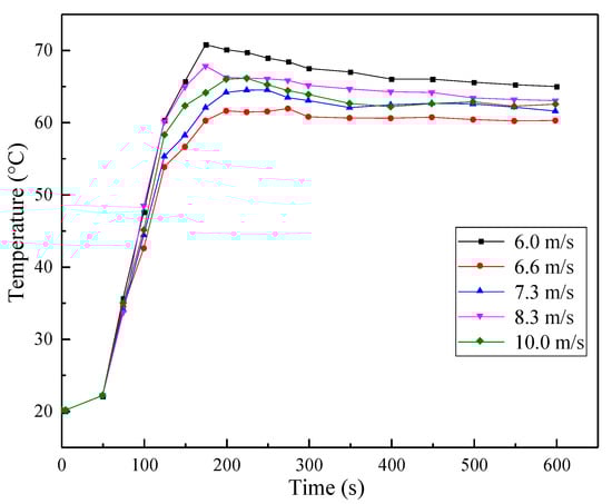 Figure 24 illustrates the ceiling temperature variations under different exhaust velocities in a 5.5 m-height-platform subway station. In the first 200 s, temperature rose gradually, then remained fluctuating within the range of 60–70 °C. As shown in Figure 25, the maximum temperature along the platform could be controlled at a relatively low level in case 6.6 m/s by comparison. The peak temperature reached 130 °C, 50 °C lower than that of 8.3 m/s. This means that under 6.6 m/s exhaust velocity, the smoke could be discharged better in a 5.5 m height subway platform.