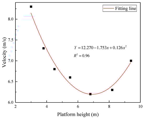 Based on the above analysis, another four subway numerical models with 3.0 m, 4.5 m-, 6.8 m-, and 8.2 m-height platforms were established for simulation. Favorable exhaust velocities were also determined, 8.3 m/s, 6.8 m/s, 6.2 m/s, and 6.3 m/s, respectively. Figure 29 presents the fitting curve of the optimal smoke exhaust velocity with different platform heights. The R-squared was 0.96. This means that the coincidence degree of the fitting curve was good. The prediction model of the optimal smoke exhaust velocity with subway platform height can be expressed as: