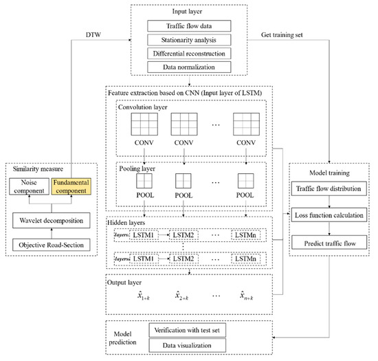 In this section, a fusion deep learning model considering spatial–temporal correlation is proposed to predict urban road traffic flow. The fusion deep learning model considering spatial–temporal correlation is essentially a fusion model, which mainly includes three parts: road section similarity measurement based on dynamic time warping and wavelet decomposition, stationarity analysis, and traffic flow prediction based on the convolutional neural network and long short-term memory network (CNN-LSTM). The method flow is shown in Figure 1, and the main principles of each part are as follows.