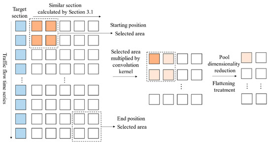 The one-dimensional convolutional neural network (1-D CNN) is used to extract the characteristics of traffic flow parameters. The processing flow of the one-dimensional convolutional neural network is shown in Figure 2.