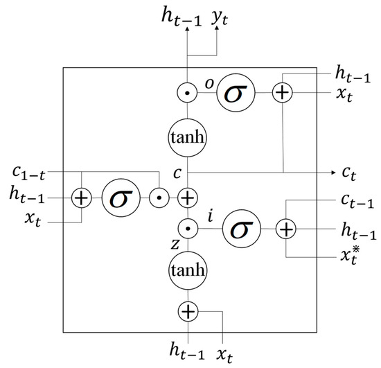 The input traffic flow time series is defined as X = (x1, x2, …, xt), the hidden state of the memory module is defined as H = (h1, h2, …, ht), the state vector of the memory module is defined as C = (c1, c2, …, ct), and t is the prediction period. The memory module operation process of LSTM is as follows: