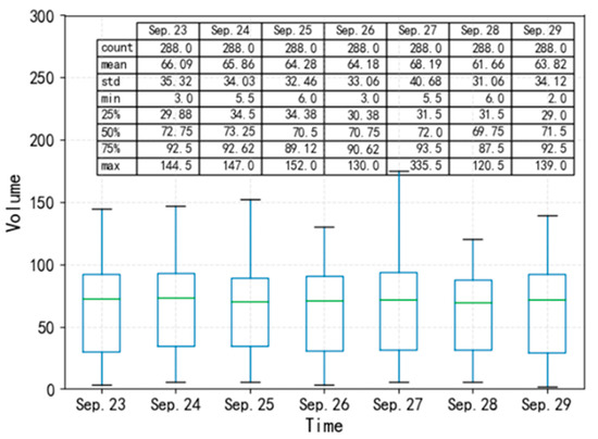 It can be seen from Figure 5 that the traffic flow distribution is generally stable and high on weekdays. Due to the increase of commuters on weekdays, the mean, maximum, and quantile of 25%, 50%, and 75% of traffic flow on weekdays are greater than those on non-weekdays. At the same time, due to the obvious morning and evening peak phenomenon, the variance of traffic flow on working days is also greater than that on non-working days.