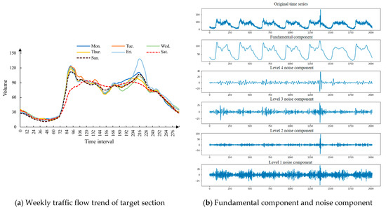 Based on the fundamental component, the weekly traffic flow trend of target section is shown in Figure 6a. The fundamental component and noise component decomposed by the wavelet are shown in Figure 6b.
