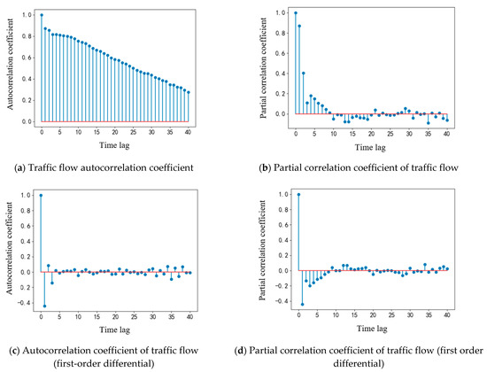 In this paper, the above three methods are used to analyze the time stationarity of traffic flow data. The calculation equations of autocorrelation coefficient and partial correlation coefficient are shown in Equations (4) and (5).