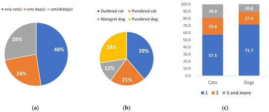 Pet ownership among respondents: (a) cat and dog owners ratio; (b) outbred and purebred cats and dogs ratio; (c) number ratio of cats and dogs per owner (in %).