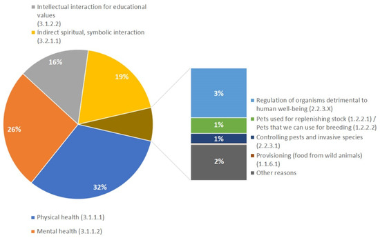 We found that more than 90% of ES provided by pets falls under the overall category of cultural services (Figure 2). Pets are primarily chosen for physical (32%) and mental (26%) health support, as well as for indirect spiritual, symbolic interaction (19%) and direct intellectual interaction for educational purposes (16%). Services connected to practical and material benefits, such as regulating services (controlling pests and invasive species/regulation of organisms detrimental to human well-being/using for replenishing stock or for breeding) or provisioning, were less prevalent in the respondents’ answers (7% in total).