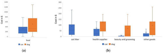 The costs of pet ownership (minimum and maximum values, mean and median, quartiles 1 and 3) in USD per year: (a) food cost and (b) cat litter, health supplies, beauty and grooming cost and other goods.