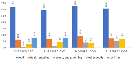 However, the costs breakdown (Figure 5) is similar for cats and dogs. From 60% to 65.8% of expenses are spent on food. The most considerable expense under this item is on mongrel dogs (65.8%) and mongrel cats (64.1%). Medical expenses range from 12.7% to 18.6%, and the highest percentage is for mongrel dogs. Further, in the case of cats, there are the expenses for cat litter—16.8% of the total. The owners of purebred dogs devote 10.4% to beauty and grooming, while the owners of mongrel dogs devote 8.2%, purebred cats 2.1%, and purebred cats 1.4% to this end. Other goods such as clothes, toys and dishes are also more expensive for purebred dog owners (13.3%). The owners of small pedigree dogs may include the cost of a dog toilet in this part of the expenses, as the question of spending on cat litter was not included in the questionnaire for dog owners. However, it is typical in Russia that even small dogs are walked on the street, and, unfortunately, the practice of collecting excrement is just beginning to form. Therefore, uncovered soil is seen as a free toilet for dogs.