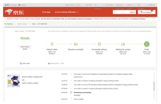 Nowadays, customers can acquire real-time location information of their same-day delivery orders [12]. However, such service is not popular in conventional e-commerce logistics services, and most logistics service providers (LSPs) only provide customers with fragmented information. Figure 1 shows that JD, as an E-retailer with its own logistics arm, only provides the information of packages entering and leaving a certain warehouse if customers choose basic logistics service. The responsible party could not be easily recognized when the cargos are damaged or lost. However, by introducing the high-traceability system, the firm can acquire real-time logistics information. For example, IoT innovator Hanhaa provides the IoT hardware “ParceLive”, which can provide highly accurate GPS tracking, record temperature/humidity, and identify if the freight has been dropped or opened. This postcard-sized equipment can easily be inserted into a parcel. The real-time logistics information can be accessed on ParceLive Portal [13].Two LSPs, Sigma Retail Solutions, and Avarto Bertelsmann adopt the ParceLive in their services and intend to satisfy customers’ need for real-time logistics information, enhance customers’ confidence in service quality, and reduce the burden of customer support [14]. Except for ParceLive, many other IoT-based logistics high-traceability solutions (also refers to the tracking system) are promoted. Roambee [15] provides the industry’s first end-to-end wireless Bluetooth Low Energy (BLE) tags/GPS/Wi-Fi-based monitoring solution. The company that adopts the solution of Roambee can customize the traceability level, at a vehicle, container, pallet, or shipment level. Arviem provides real-time, carrier-independent data on the cargo condition (location, estimated time of arrival, temperature and humidity, door opening and light intrusion, shock) during the whole journey. Customers can view all freight movements and other conditions in real-time on an interactive map. The service can minimize the risk of damage and theft [16]. Adopting IoT technology significantly promotes logistics operation efficiency. The leading less-than-truckload (LTL) company in the US, Old Dominion FreightLine, Inc., invests in improving logistics traceability and reducing the freight loss from 1.5% to 0.2%, which is 60% lower than the industry average level [17]. By continuously updating and optimizing information systems, YTO Express (Famous Chinese LSP) reduced the complaint rate by 92.89% in 2019 compared with that in 2018 [18].