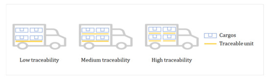 The freight passes several distribution centers until arriving at the designation, and in the meantime, several logistics teams will deliver the freight in a sequential manner (different teams responsible for different logistics legs). The parcel will be loaded into a smart pallet with IoT equipment during transportation. In our study, logistics traceability is measured by the accuracy level of the tracking system, where the accuracy level depends on the capacity of the smallest traceable unit. When a high-traceability system is adopted, the smallest traceable unit is the single smart pallet. The company can customize the size of the smart pallet. The intensity of traceability increases as the traceable unit capacity decreases. In the most extreme situation, pallet capacity is precisely matched with the size of a parcel (similar to ParceLive, the IoT equipment is put inside the parcel), which means that each parcel is tracked separately. Customers can monitor any real-time indicator (location, temperature, shock, etc.) of their freights. Figure 2 shows how the pallet size affects logistics traceability. The smaller pallet capacity grants higher logistics traceability while incurring a higher operation cost (as more pallets will be needed when delivering full-truckload freight).