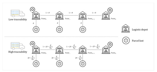 Our work is related to research about traceability in supply chain management. The food and medicine industries are two of the few industries that widely adopt traceability systems [35]. Ensuring a safe supply is a difficult in food supply chains task where information asymmetry exists [36], and recalling specific batches of products are common in the food/medicine industries, however, adopting the traceability system significantly reduces social risk. Aung and Chang [37] summarized the advantages of the traceability system including reducing the food recall cost after an accident by compressing the recall scale. The system can promptly warn the company to reduce the possibility of a recall event. However, traceability in the above industries does not necessarily improve product quality. Resende-Filho and Hurley [38] indicated that traceability is not a clear signal for safe food, and government regulations based on mandatory traceability and sanctions do not necessarily lead to food safety. Starbird and Amanor-Boadu [39] showed that too high or too low traceability will affect the profit distribution between producers and processors, which will lead to producers providing less reliable products. Sun and Wang [40] analyzed a procurement problem in the food industry, and their research was conducted in the scenario where traceability can/cannot improve product quality. Traceability is an additional attribute that is independent of tangible product quality; hence, traceability can relieve the consequence of food recall but not avoid it. By contrast, traceability in the logistics industry directly affects the service quality (delivery failure rate), making our study differ from the aforementioned works. Some scholars emphasize the integration of traceability information and supply chain operation can improve the firm’s operational performance [41,42]. Wang, X. et al. [41] shows the benefits of integrating traceability systems with supply chain management processes through case study analysis. Wang, X. et al. [42] build an integrated optimization model about optimal production planning which combines product safety related traceability factors with operations factors. Similarly, our work also addresses how traceability can be incorporated into a firm’s operation decision and improve the operation performance eventually.