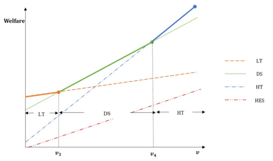 In the HES strategy, the company exits the TNS segment and only serves the TS customers with high-traceability services. The company determines the PPFS r * , VAS price ε * , and high-traceability level τ H to induce TS segment to choose high-traceability service and TNS segment to choose nothing (leave the system):