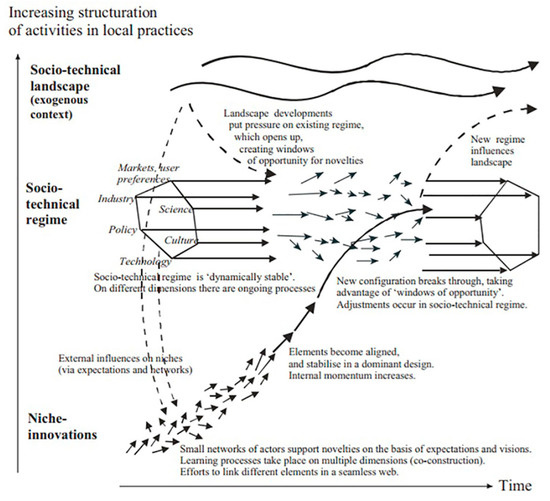 Sustainability transitions (see Figure 1 below) are goal-oriented rather than emergent processes in complex environments [61], address public goods, e.g., the environment, and there is debate about the merit of particular solutions [62]. Geels [63,64,65] argues that the multi-level perspective (MLP) on sustainability transitions highlights the multi-level and multi-actor nature of socio-technical regime change and acknowledges the need to enhance MLP with theories of agency and governance issues [66] to account for how transition can happen [67]. As Baker [68] notes, the governance of sustainable development has in general moved from state-led approaches to multi-level and multi-sector governance networks. Such a focus implies that agency is distributed across and between networked organisations.