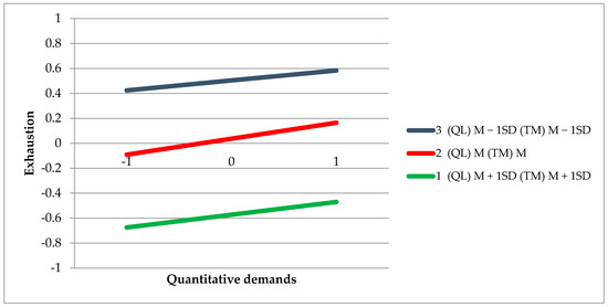 Conditional effect of quantitative demands on exhaustion at: 1—High values of (QL) quality of leadership and high values of (TM) trust in management, 2—Mean values of (QL) and mean values of (TM), 3—Low values of (QL) and low values of (TM). The figure shows the standardized results.