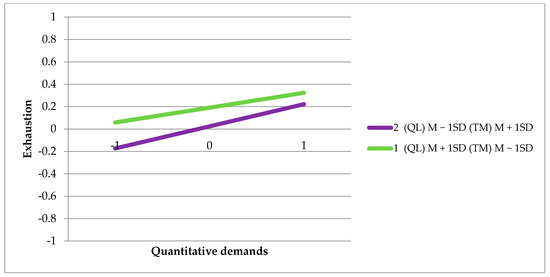 Conditional effect of quantitative demands on exhaustion at: 1—High values of (QL) quality of leadership and low values of (TM) trust in management, 2—Low values of (QL), high values of (TM). The figure shows the standardized results.