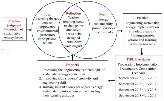 The Makers Club was conducted over four years and four action research cycles (August 2015 to July 2019). First, schoolteachers made a practical judgment on environmental issues and four teachers in this study decided to participate in a professional development program organized by a nearby university to enhance teachers’ professional development in line with the energy education project promoted by the Ministry of Education [39]. They established a Makers Club and designed the engineering-centred PjBL on the sustainable energy curriculum to guide club students in their project-based work, incorporating global warming and energy sustainability issues into the curriculum (August 2015). The study was conducted in one unit per year for four years (Figure 1). Each year, the four club teachers reflected on the development of students’ creativity and engineering technical skills as they designed the curriculum, asking themselves: Has the concept of environmental sustainability been translated into action? Have attitudes toward learning improved? Then the curriculum was revised and adjusted per the results of these questions, and an action plan for improvement was developed for the following year.