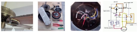 The primary teaching content in the Preparation phase was to disassemble the ceiling fan, train the students to know the structure of a ceiling fan, sort the disassembled parts, and develop good work habits. The principles of various types of generators were also explained in this phase. The disassembled ceiling fan components and wiring are shown in Figure 2.