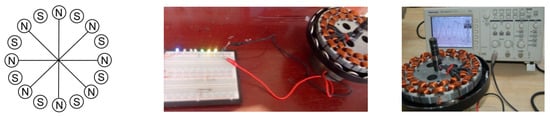 For example, the students illustrated the principle of wind power generation based on Lenz’s law, which states that when the magnetic field changes, the coil generates an induced current to resist the change in the magnetic field. Group C students used the assembled wind turbine to show the voltage waveform data generated by the rotation of the wind ventilator under different magnet arrangement conditions. The results showed the peak-to-peak voltage value with 8 N poles and 8 S poles was as high as 54.0 V (Figure 5, SC3-N6-Y5).