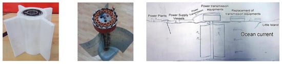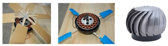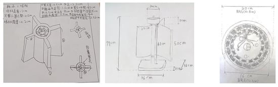 The students worked in groups to experiment with wind power generation by making fan blades and combining them with ceiling fans using thick cardboard and plastic building blocks. After several months of brainstorming, the students in Group C completed the integration of the ventilation ball and the ceiling fan coil assembly into a working wind-power generation device (Figure 4).
