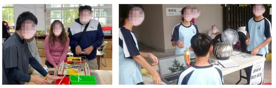 Students in the club promote the concept of energy sustainability, teachers and students growing together to turn the concepts into action. Each year, the club teachers and the school administration arranged the presentation for each group to present their work at the school. The group members were required to present and explain their project work. All school students were encouraged to visit or operate on the products during class time and provided suggestions and ideas to the club students. Therefore, the club teachers used the lunch break and club time to train the group members’ presentation skills. During this phase, students were assigned tasks and roles and were given the opportunity to make oral presentations. The teachers guided the Makers Club students to use the momentum of their project presentations to promote the idea of energy sustainability and love for the earth, which was expected to create a school-wide reflection on the importance of environmental sustainability and translate it into action (Figure 15). For example,