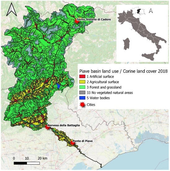 The Piave River, in the northeast of Italy, extends from the Eastern Alps to the Adriatic Sea. It is the fifth-largest Italian river with a watershed of 4127 km2. Approximately 300,000 people live in the catchment, which extends across three Italian regions. The upper catchment (from 500 to 1800 m a.s.l.) is covered largely by evergreen and deciduous forests (mainly conifers and broad-leaved trees), while alpine pasture/prairies and rock emergence dominate the highest elevations (above 1800 m a.s.l.) and with limited agricultural activities (Figure 1). Agricultural land use is more prominent in the lower part of the catchment (below 500 m a.s.l) with an increase in impervious surfaces [73].