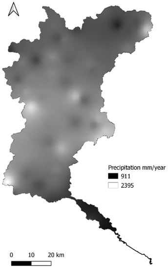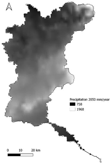 Future projections represent an ensemble average of 15 Atmosphere–Ocean General Circulation Models of the CMIP5 multi-model data set, corresponding to the IPCC Assessment Report 5 [108]. We selected the median emission scenario RCP 4.5 that globally predicts a +1.4 °C (±0.5) by 2050 [77]. This scenario confirmed a decrease in precipitation in 2050, with an estimated minimum of 758 mm/year and a maximum of 1968 mm/year (Figure 6).