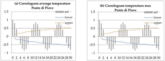 Figure 4. Temperature correlograms (a,b) showing an elevated seasonal component, indicating the regularity of the monthly average temperature and maximum monthly temperature.