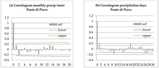 Figure 5. Precipitation correlograms (a,b) showing a high autocorrelation and more complex dynamics.