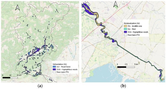 Figure 7. (a) B1 Land cover scenario, the polygons are the areas with reforestation (313) mixed forest and (3116) hygrophilous forest in the upper catchment. (b) A1 Land cover scenario with riverine hygrophilous forest (class 3116) and erodible area (class 331) of the lower catchment section from Ponte di Piave to the sea.