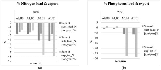 Figure 8. The percentage reduction in N (a) and P (b) load and export in 2050 between different NBS scenarios.