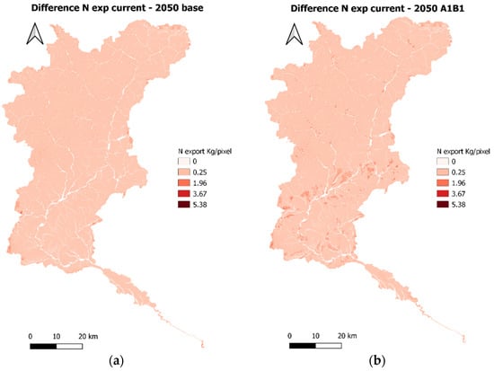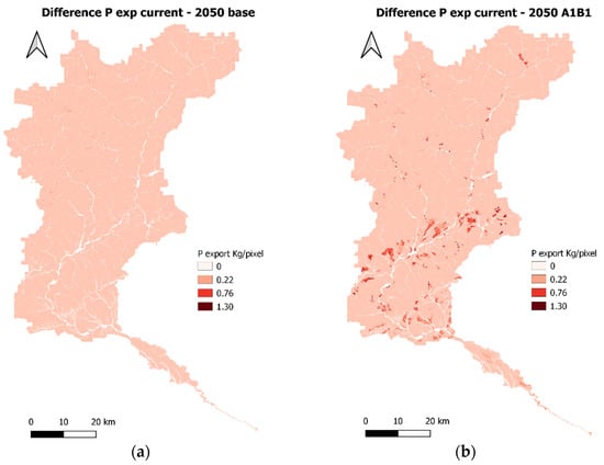 By using the precipitation scenario raster for 2050, changes in nutrient export were explored for each scenario of land use, with, without and combined NBS. By applying the same land cover in 2050, P export is expected to increase by 1.7% (Table 6). A decrease in the delivery and retention of total N and total P reflected the precipitation reduction for the 2050 projection [77].